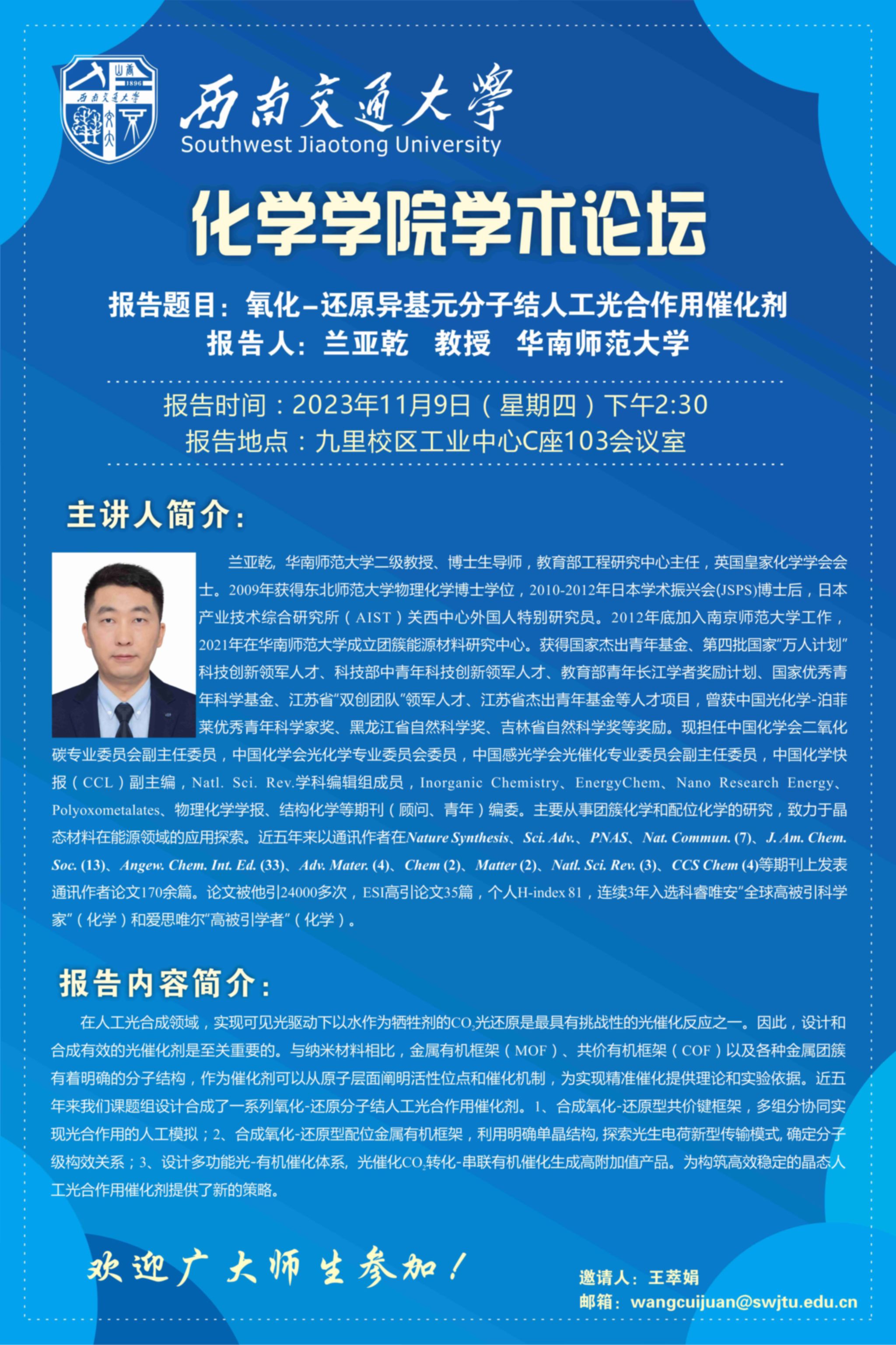 报告题目:氧化-还原异基元分子结人工光合作用催化剂