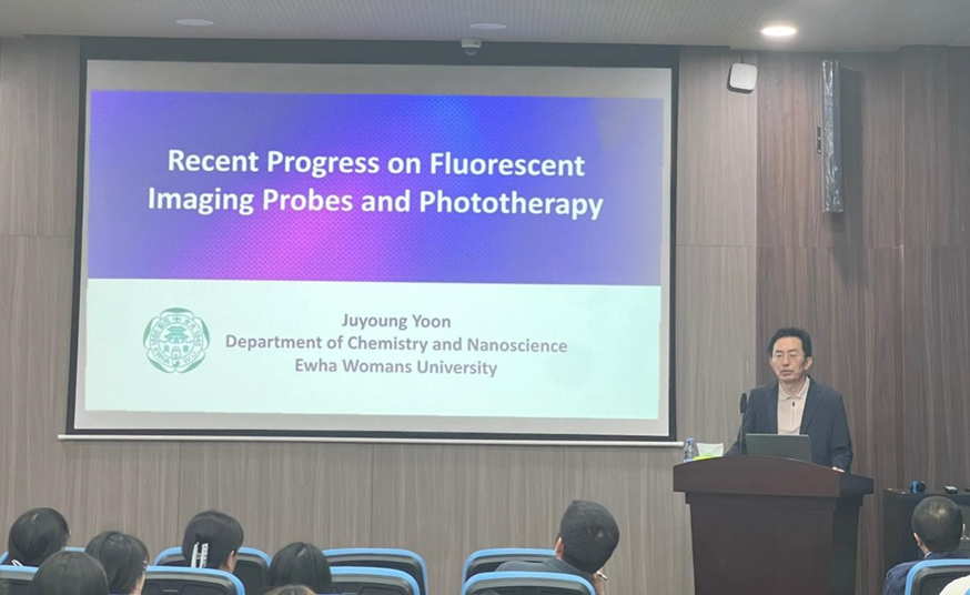 Juyoung Yoon教授首先介绍了荧光探针、光动力治疗、光热治疗和相关光学过程的机制,重点阐述了如何通过可切换的光治疗诊断纳米材料,实现特定的生物传感、高质量成像和靶向治疗,并分享了其团队在新型探针设计与合成方面的创新成果。Yoon教授团队合成的近红外双光子荧光探针,不仅能特异性检测羧酸酯酶 (CE) 在体内和原位的活性,而且还能在全身给药后靶向原位肝肿瘤;通过设计、合成了具有光声成像引导的探针,能协同实现光动力和光热治疗;以及一种针对内质网的粘度半花菁染料用于非酒精性脂肪肝的诊断,并通过激活焦亡途径进行光动力癌症治疗。同时,Yoon教授提出反应差异可能为设计选择性光动力剂以消除革兰氏阳性细菌感染的疾病开辟一条新的途径。最后,Yoon教授介绍了其科研团队成员,生动展现了团队内部和谐融洽的氛围。