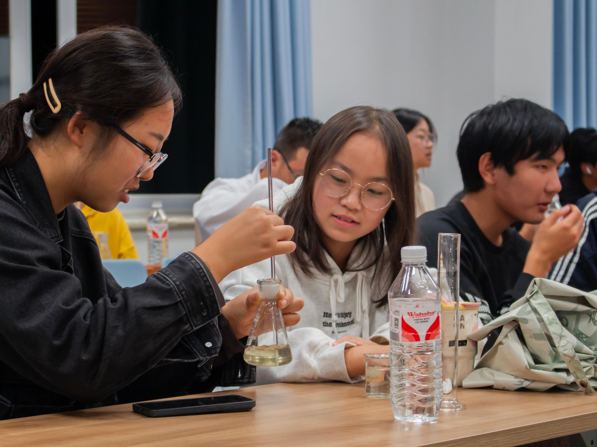 或许你见过会结晶的天气瓶,像流沙的黄金雨,但你亲手做过会变色的变色瓶吗?此次游园会中,哆啦AV梦 学生会的工作人员们准备了“变色瓶制作”的趣味小实验,同学们在实验中,不仅锻炼了称量、配置溶液等实验操作动手能力,更增强了对化学的热情与兴趣!活动结尾的科普视频也给同学们留下了深刻的印象:三镜反应、结晶析出、络合变色……每一次的原子碰撞都擦出了不一样的火花,每一次的分子改变构成了我们这个绚丽多彩的世界!