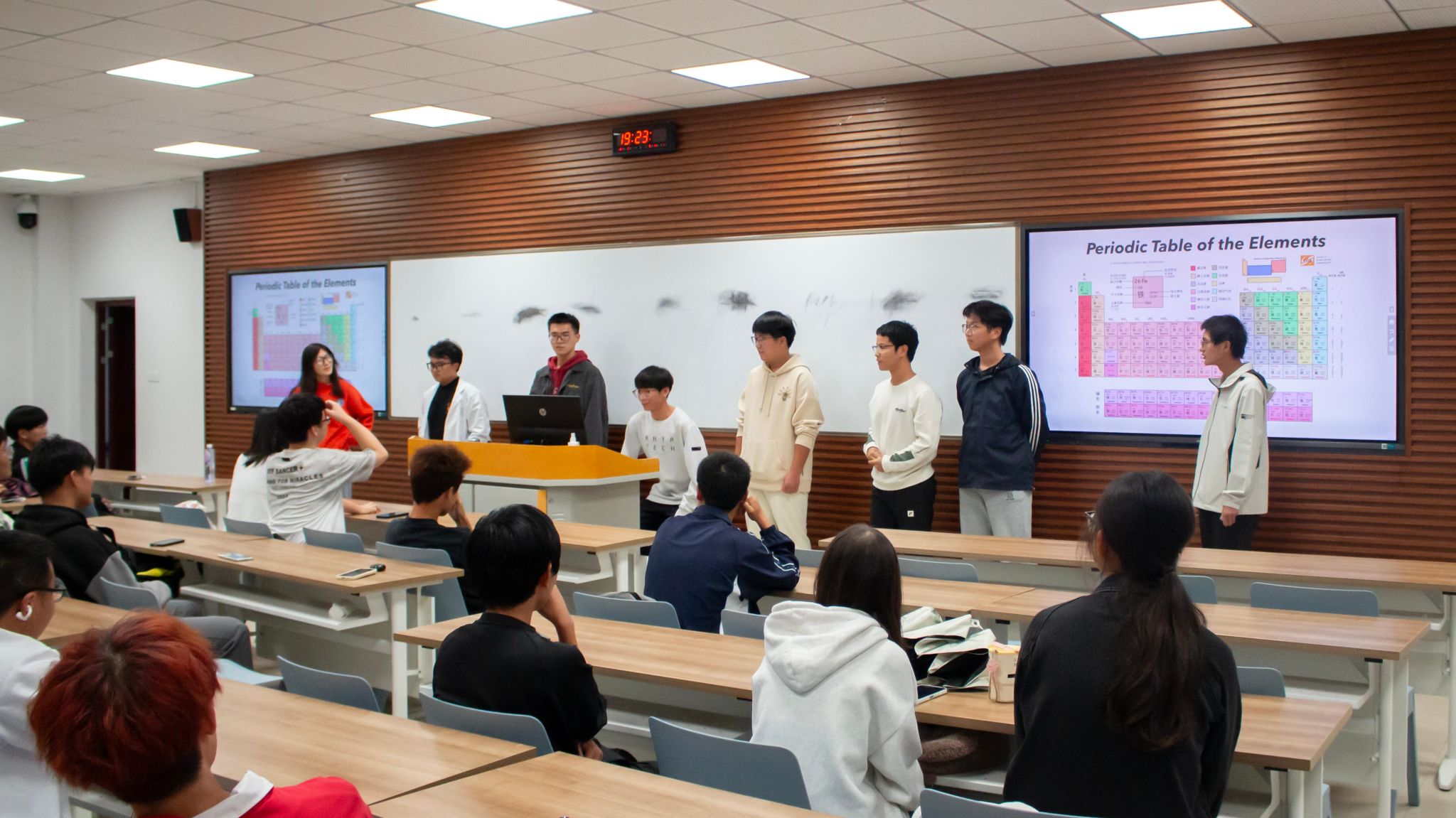 此次游园会将同学们分为五组展开比拼,知识竞答中,大家积极活跃,争相展现自己的知识与学问。随后主持人介绍“化学版萝卜蹲”游戏规则,同学们在轻松愉快的游戏中,加深了对化学的理解和认识,活动氛围也逐渐活跃。