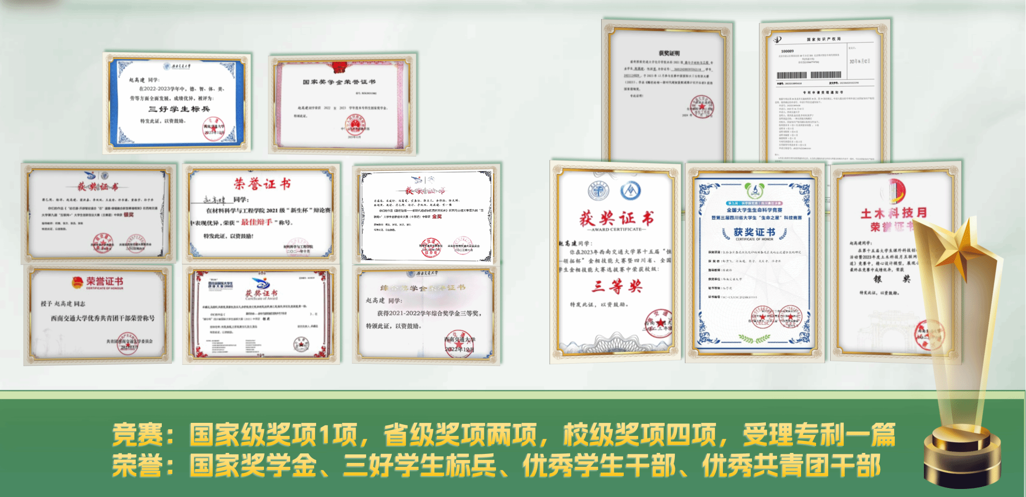 学业为基,以勤补拙。从大一的中游到三年的专业第一,逆袭背后是无数个清晨的图书馆与深夜的台灯。我梳理知识脉络,将理论联系实际:在《高分子化学》课上,以混凝土增韧案例讲解聚合机理;在《工程力学》中,用实验数据反推结构设计。最终,国家奖学金、三好学生标兵的荣誉,成为对坚持的最好注解。