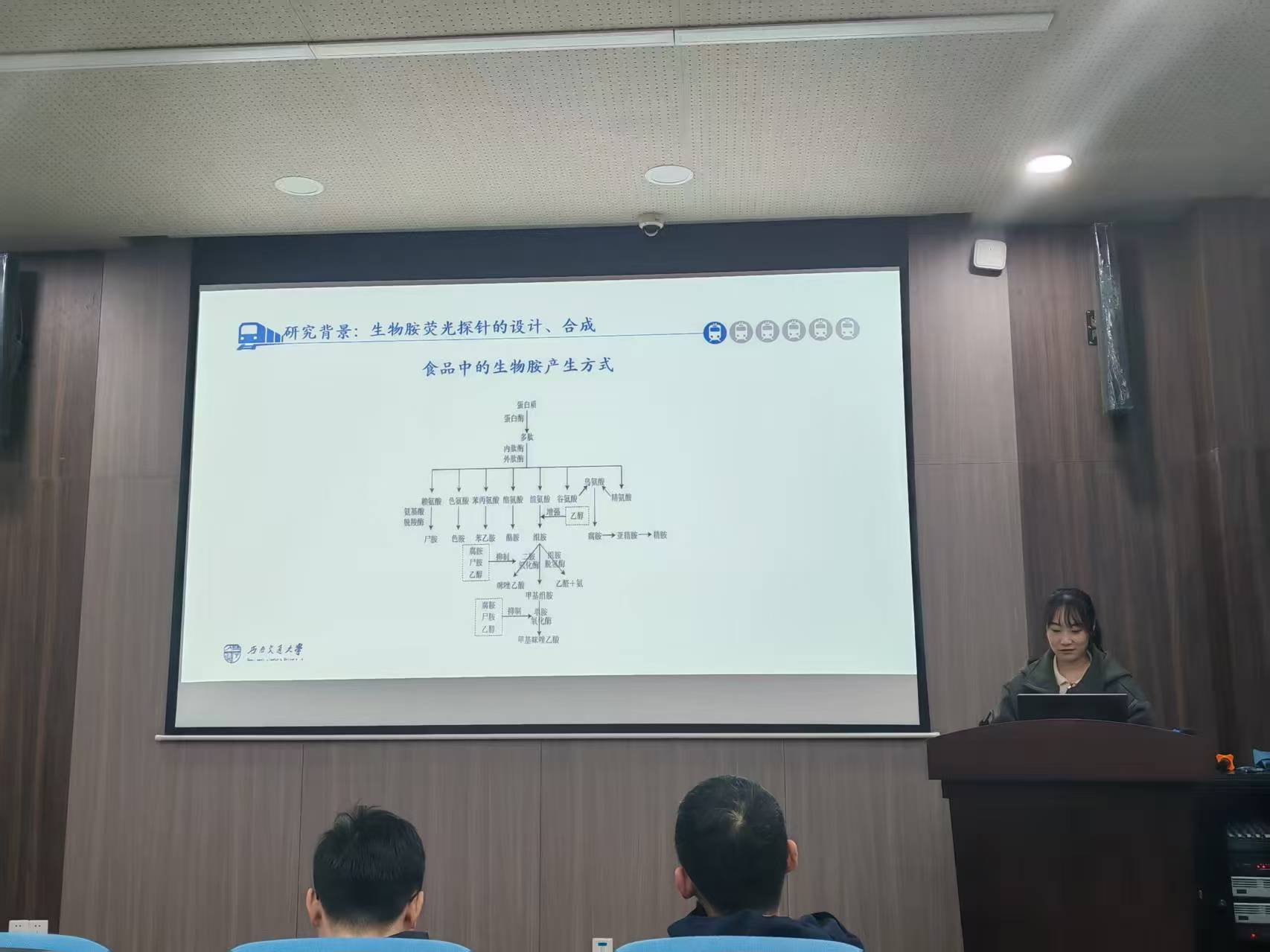 2021级博士研究生杜巍同学以“新鲜食品腐败的无损可视化检测”为题进行了精彩的报告。针对当前食品新鲜度检测中探针单一检测模式及色差小难以肉眼辨识的局限性,杜同学设计合成了一种能够在紫外荧光双模式下进行检测的探针,其色差显著大于110nm,成功应用于肉类新鲜度的有效检测。
