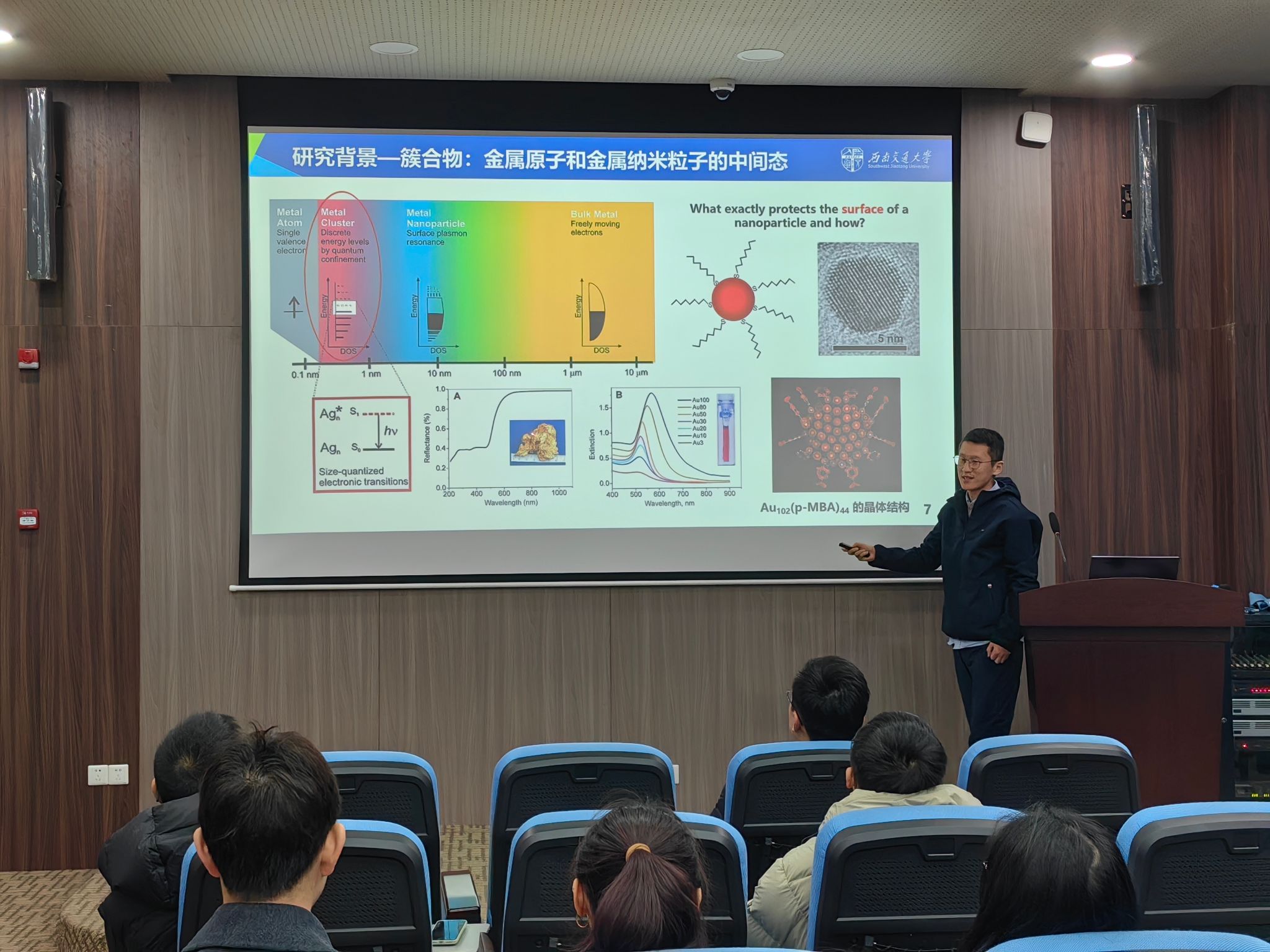 本次论坛邀请陈子毅老师作为开幕报告的嘉宾。陈老师以其丰富的学习和工作经历为基础,生动阐述了币族金属簇的组装技术、晶体结构特征及其潜在的广泛应用前景。紧接着,他介绍了铁钴类普鲁士蓝化合物的电子转移行为及其调控机制,并就其光致磁效应展开了深入探讨。最后,陈老师针对该体系现存的挑战进行了分析,并展望了可能的解决方案。